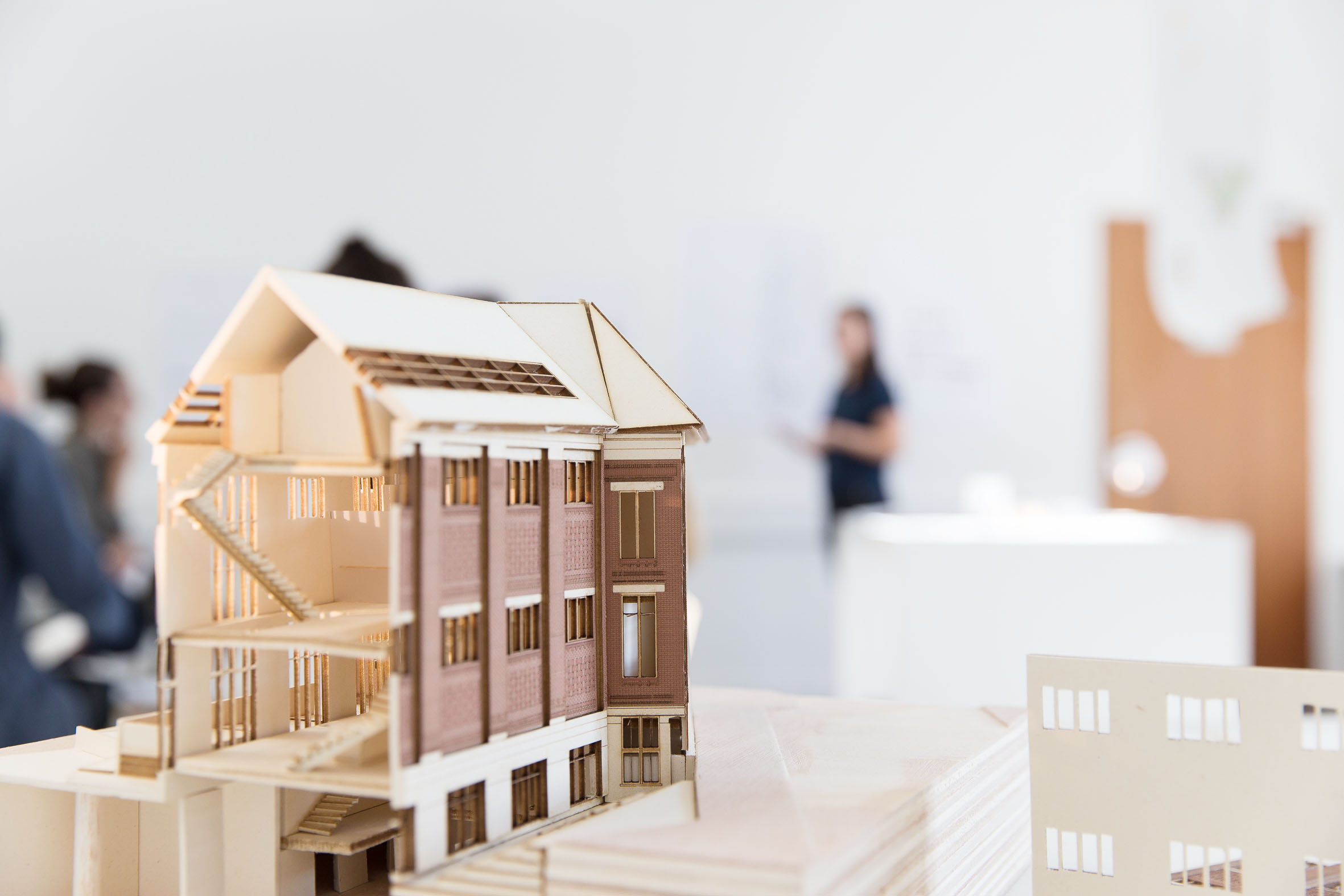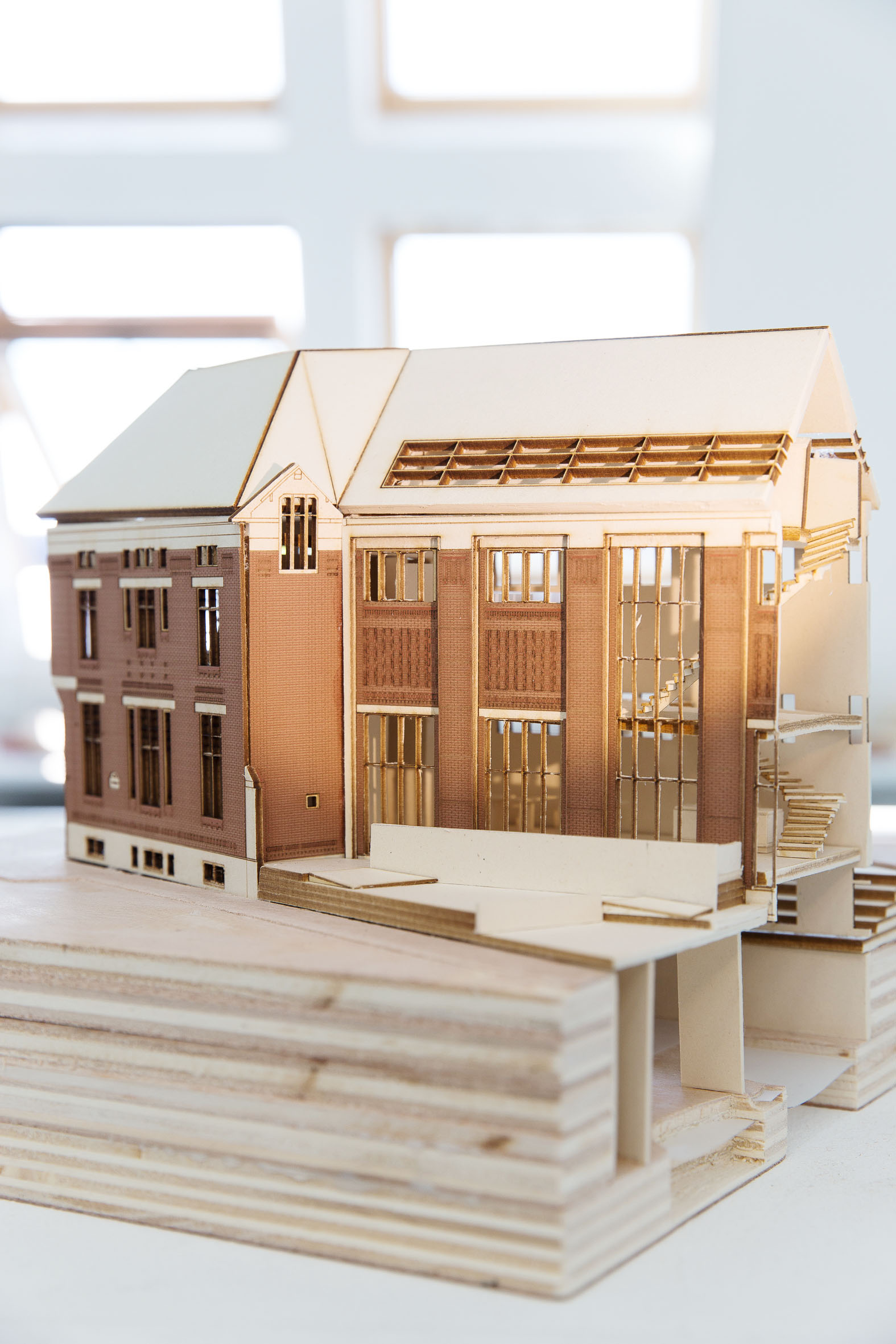 The attic hangs above the other floors. The spaces are smaller for a more individual practice whithout