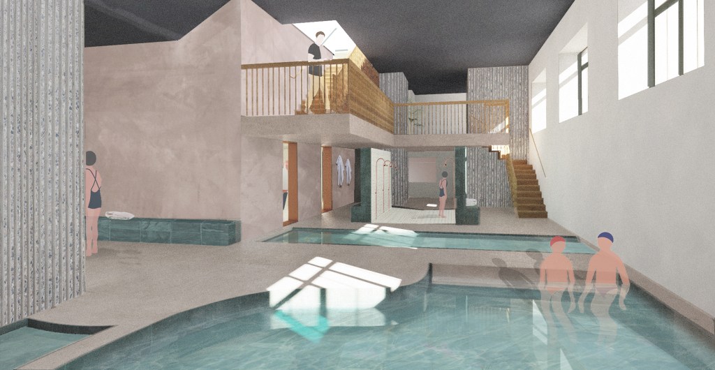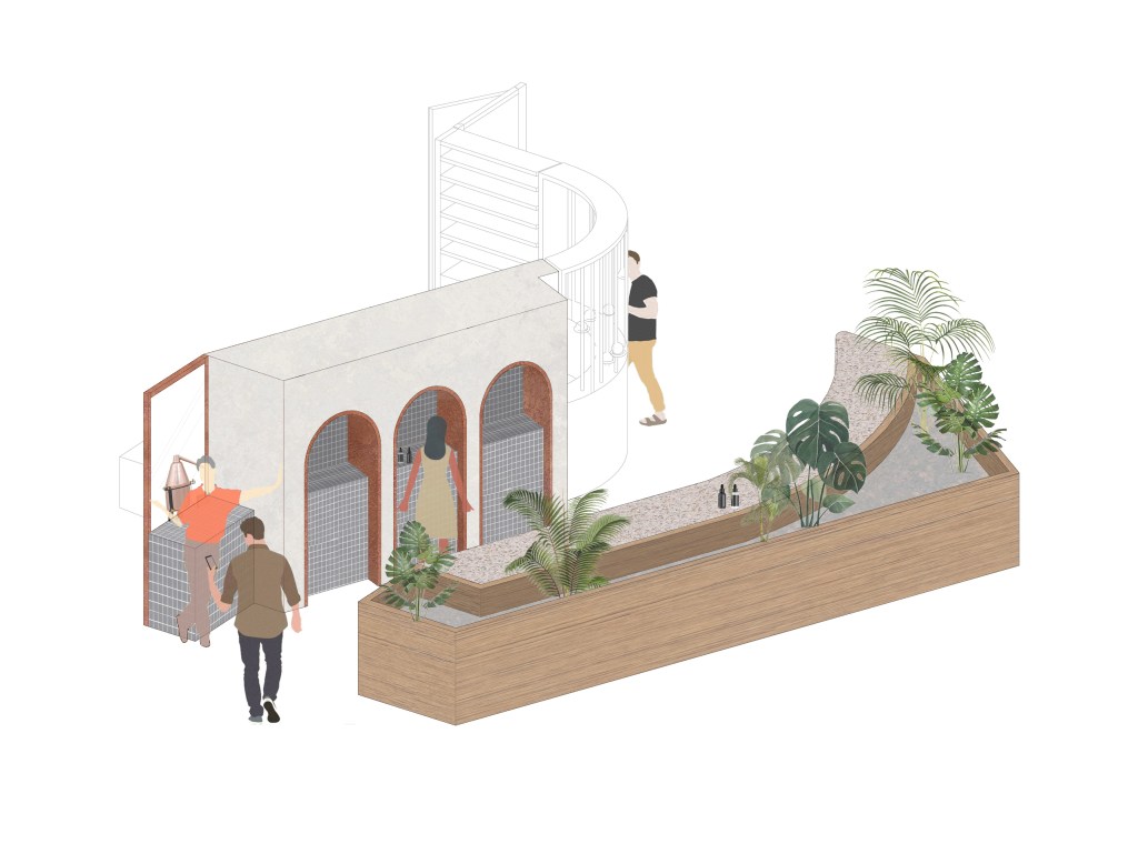 a contemporary interpretation of the original purpose of the building : hospitality and health.