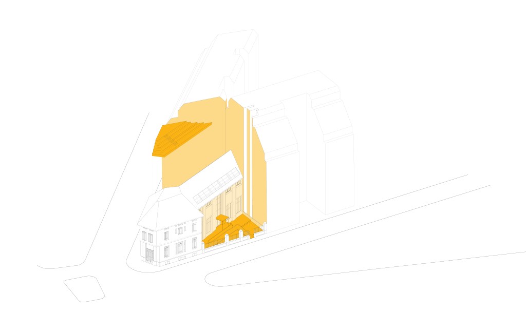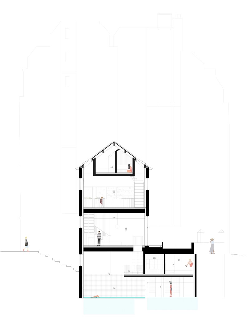The basement of this building is made of individual therapeutic spaces. Here, the building is bringing back to its initial purpose of care and refreshment through water. Three baths are thinking in terms of temperatures, bathing time and smells. The add of essential oils or medical plant extracts in water is provided with,