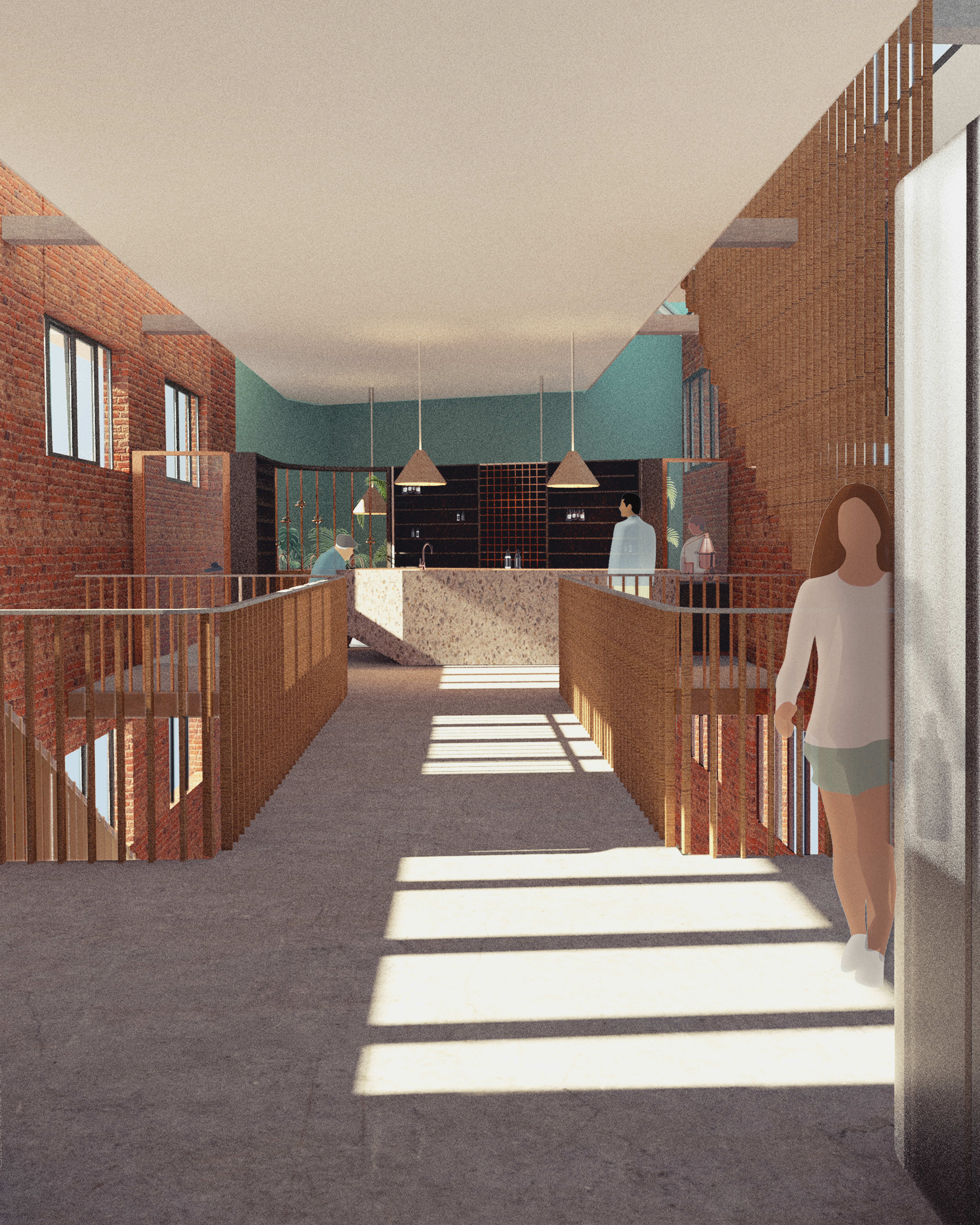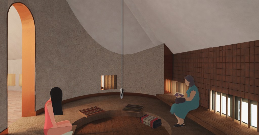 The learning spaces and the healing spaces are puting side to side according to two timescales : one short and dynamic is bond with the city and the other one is slow and private. As soon as the door is opened, the use of smooth and passive tactics encourage a curative architecture. New smells welcome the patient. The urban life is paused to reconnect with our sensations and our emotions. For example, from the street, the signage is organised thanks to earthly smells to create a sluice with the district. The city ’s stimuli are slowly excluded to encourage the introspection around the natural rythms.